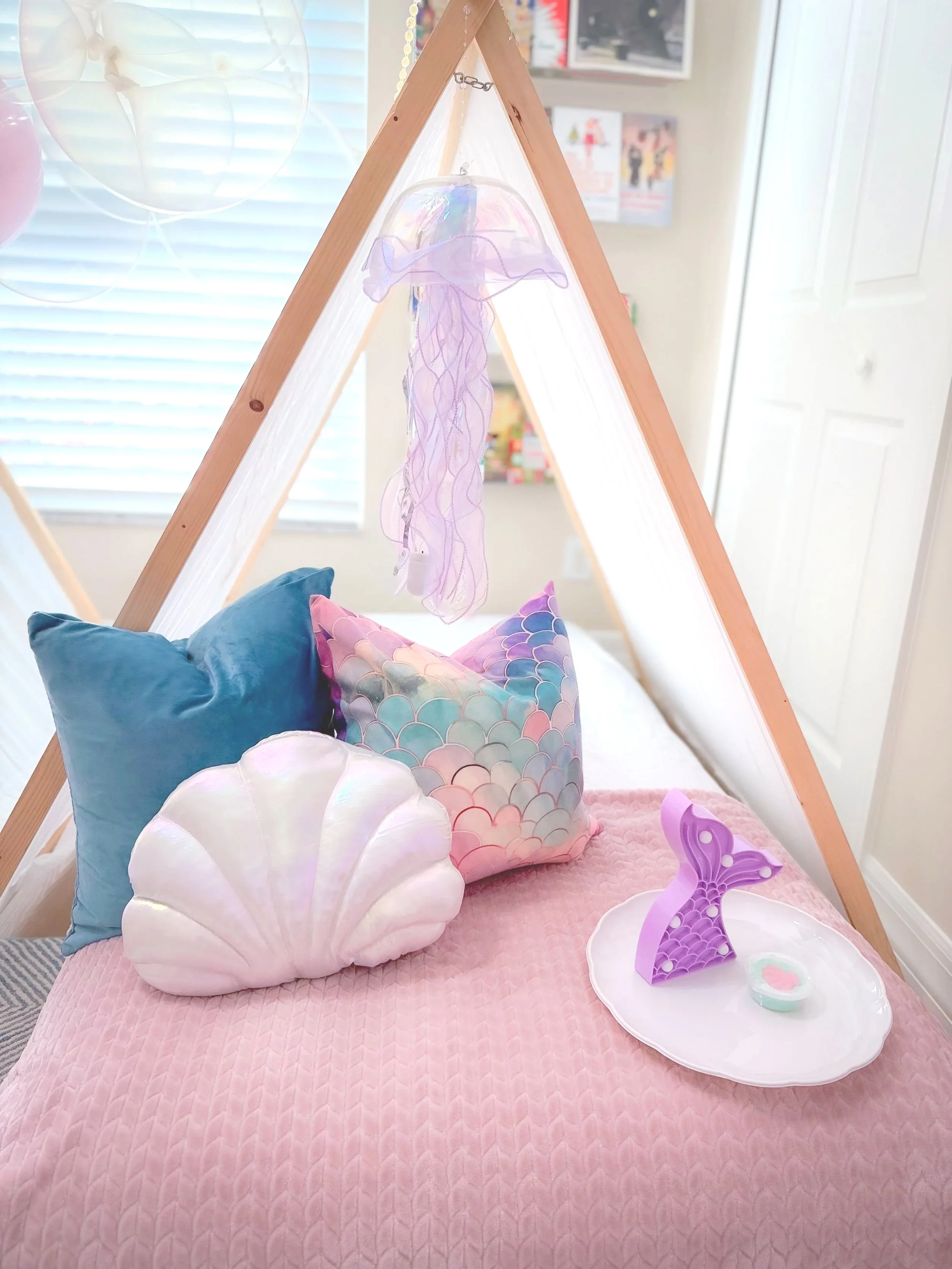 Plush pillows layered with mermaid-themed accents
